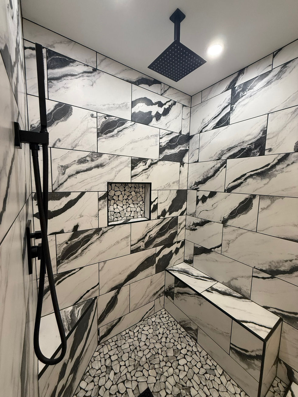 Indulge in our luxurious bathroom designs featuring marble tiles, bathtub, and modern fixtures.
